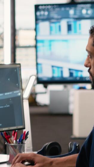 Vertical Middle eastern guy uses artificial intelligence neural networks for urban redevelopment project, big data and advanced analytics streamlining architectural design. Sustainable housing. Camera B. Pro Video