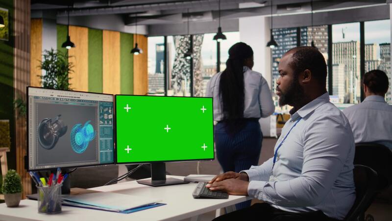 Renewable energy engineer in modern office advances wind turbine technology using green screen computer, applying new materials and designs to optimize power generation, camera A Pro Video