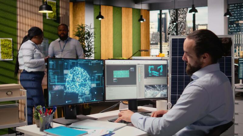 Sustainability RD specialist uses neural network tech to design production lines for solar panel assembly. Employee uses deep learning to enhance solar cells, improving clean energy output, camera A Pro Video