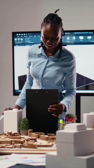 Vertical Black property developer discussing residential project investment and strategy for infrastructure growth and city planning in a bright office, analyzing blueprints and 3D models. Camera A. Pro Video