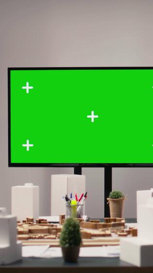 Vertical Empty desk layout in architectural real estate office with chroma key, building project preparation featuring property search documents and blueprints. Zoning regulations for approval. Camera A. Pro Video