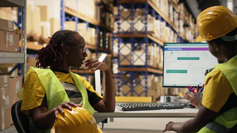 Black warehouse clerks team overseeing parcel status via tracking info on computer, working in logistics center for distribution operations. Managing inventory and dispatch protocol. Camera B. Pro Video