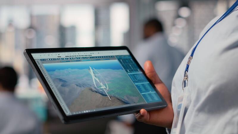 Close up of engineer working on futuristic vertical wind turbine CAD design used for green energy research. Worker using digital modeling tablet app to upgrade wind VAWT energy generator gear Pro Video