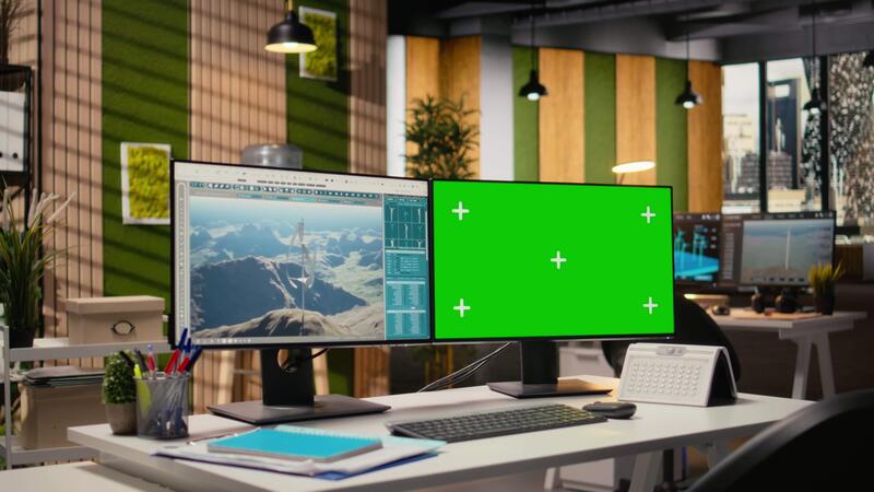 Futuristic windmill prototype simulation on green screen mockup PC in research and development office. Next generation vertical wind turbine blueprint on CAD software on chroma key computer Pro Video