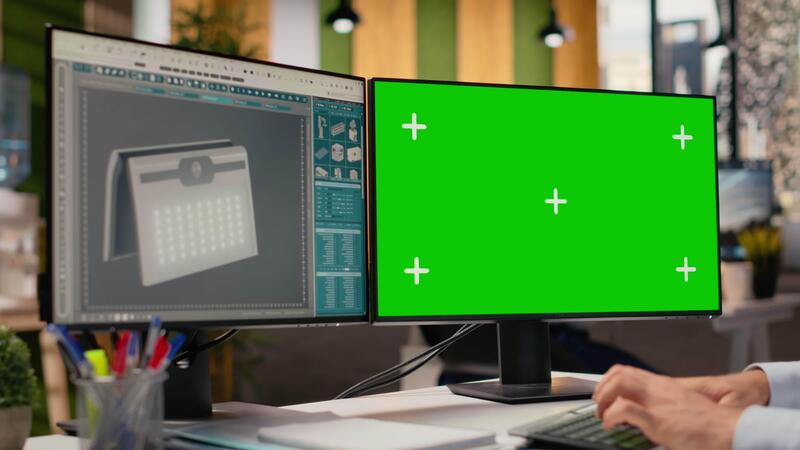 Close up of technician using green screen mockup PC to create solar powered device design with green energy. RD expert uses chroma key computer, creating eco solar gadget prototype, camera B Pro Video