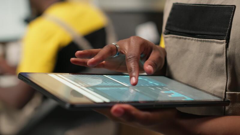 Close up of distribution hub worker overseeing supply chain process for e-commerce. Reviewing logistics and shipping data on tablet, updating tracking labels for order fulfillment. Camera B. Pro Video