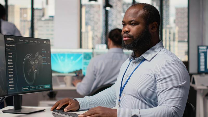 Engineer in office working on wind turbine CAD design, doing sustainable energy research. RD department expert doing digital modeling of wind energy generator infrastructure using software, camera B Pro Video