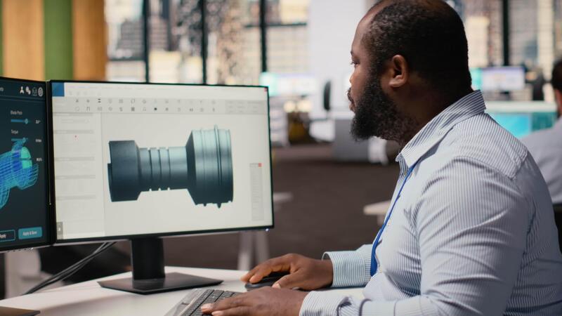 Engineer in office working on wind turbine CAD design to develop technology improving environmental performance. RD expert coming up with innovative materials for wind energy generator, camera B Pro Video