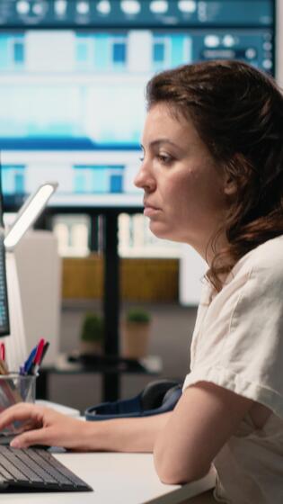 Vertical Real estate analyst uses artificial intelligence for blueprint design and project development, machine learning and big data analytics enables AI engineering for commercial property. Camera B. Pro Video
