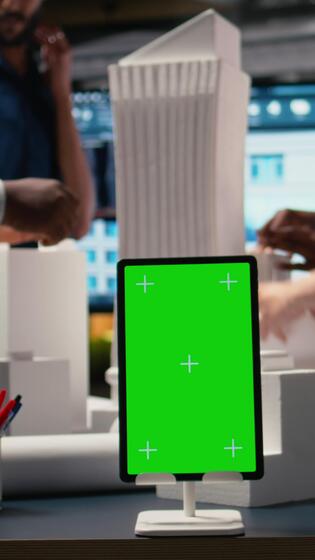 Vertical Engineers team share master plan ideas next to chroma key display, using 3D architectural models and blueprints for construction layout details. Modern design city planning in a session. Camera A. Pro Video