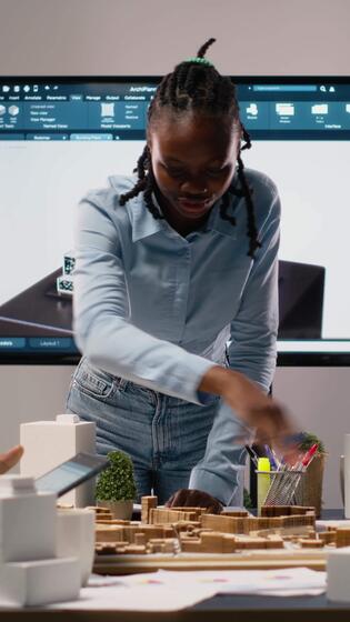Vertical Multiethnic architecture developers using 3D models in brainstorming meeting, shows architectural software to work on structural city planning. Residential project for urban development. Camera B. Pro Video