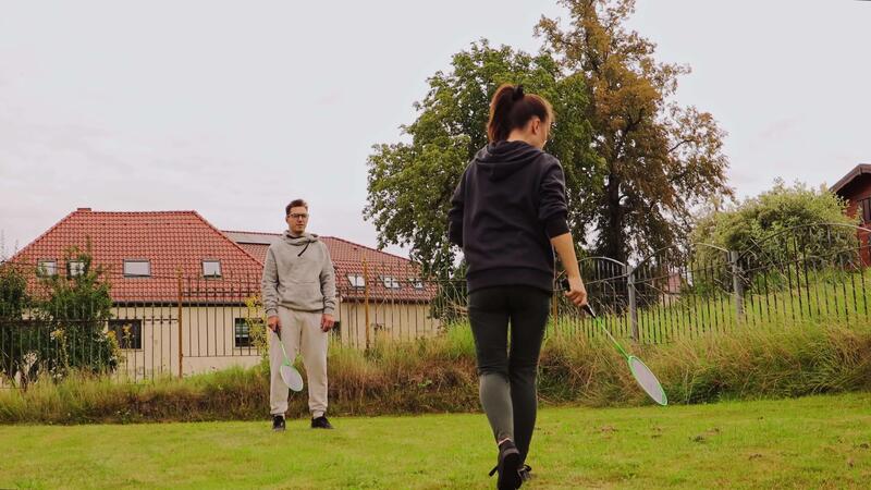 In a vibrant backyard, a couple learns the basics of badminton, practicing serves and rallies while enjoying each other's company. The atmosphere is filled with fun and supportive moments Pro Video