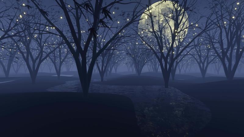 looping moving forward Walking into the forest at night, there are puddles and fog. Lots of fireflies on the trees. Super Full moon in the sky. 3D Rendering. Free Video