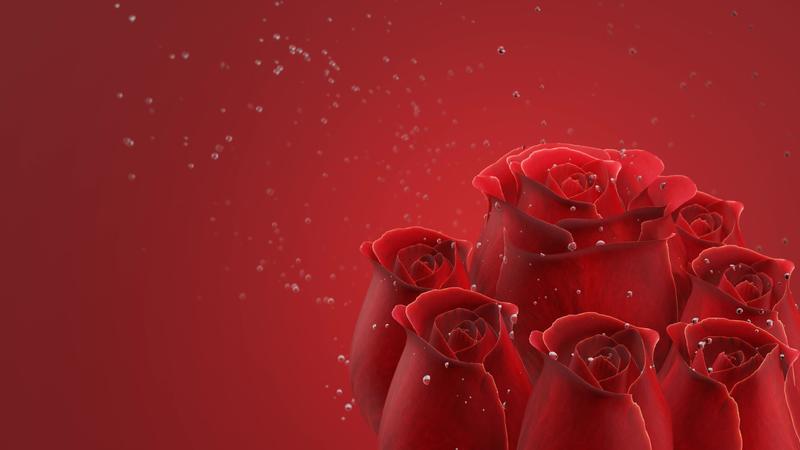 Red rose without stalks and leaves on red background. The rose has dazzling water droplets and bubbles floating behind it. 3D Rendering Free Video