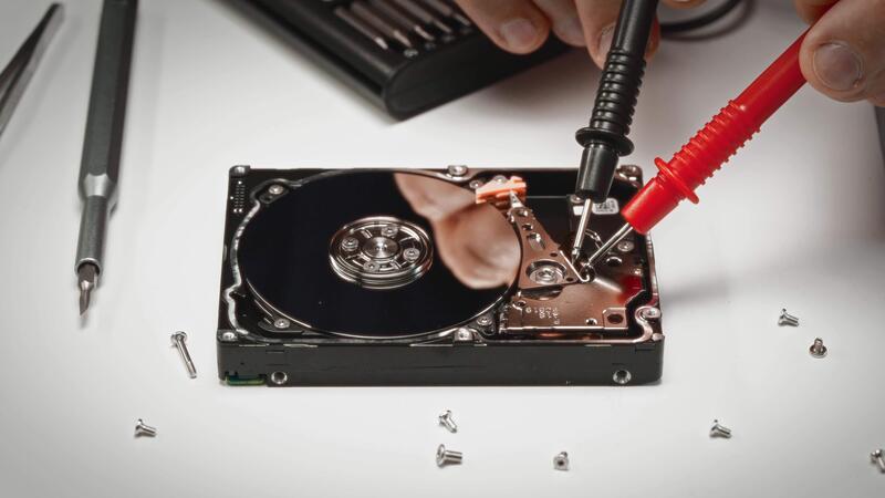 Close-up of disassembled hard drive as technician tests electronics with multimeter probes. Professional data recovery or component diagnostics in progress. Pro Video