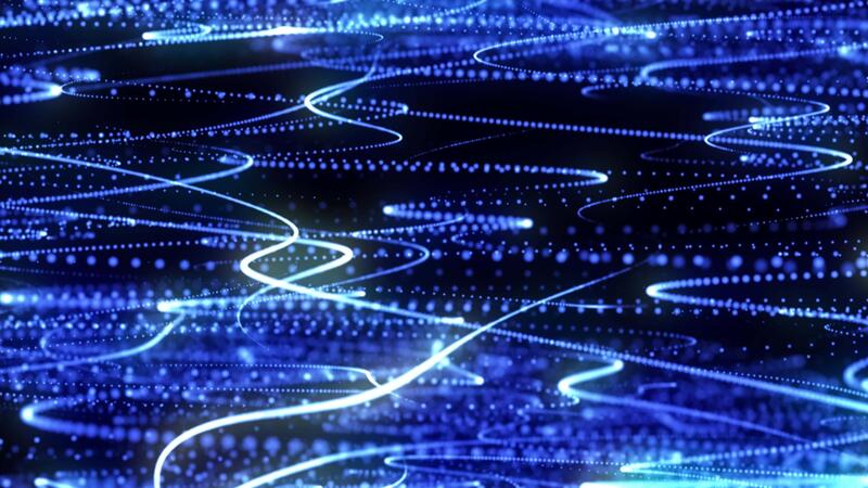 Dynamic abstract image of glowing blue particle waves and light trails Free Video