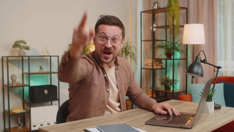 I choose you. Excited businessman programmer software developer working on office laptop pointing to camera, looking with happy expression, making choice, showing direction. Freelancer guy inviting. Pro Video