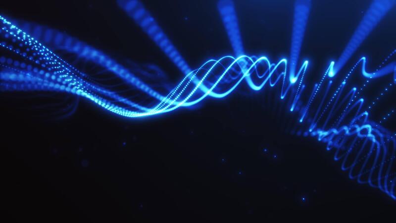 Abstract glowing blue frequency waves with dynamic flowing dots and lines on dark background. Futuristic technology data visualization in seamless 4K loop Pro Video