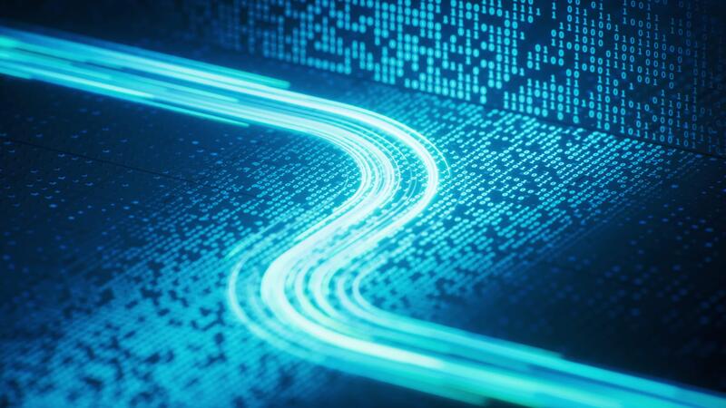 Flowing neon line with binary data background, 3d rendering. Pro Video