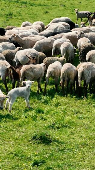 Drone view of a flock of sheep grazing on a green pasture. Sheep and goats graze on a green field Pro Video