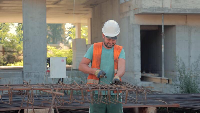 Builder In Helmet And Safety Vest Tying Rebar, Smiling Man Working On Construction Site With Concrete Building Frame In Background, Daytime Work Scene Pro Video