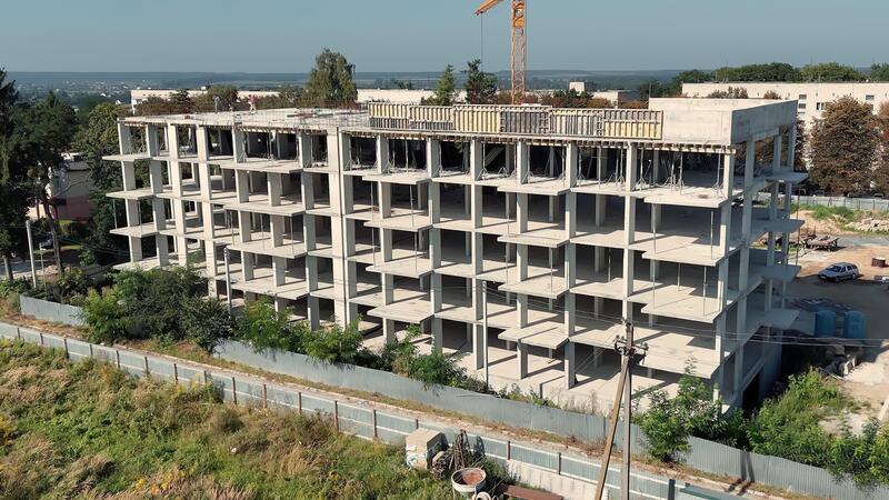 Close Up View Of Unfinished Concrete Building Frame, Workers On Top Floor And Tower Crane Behind, Construction Progress Of Multi Storey Structure Pro Video