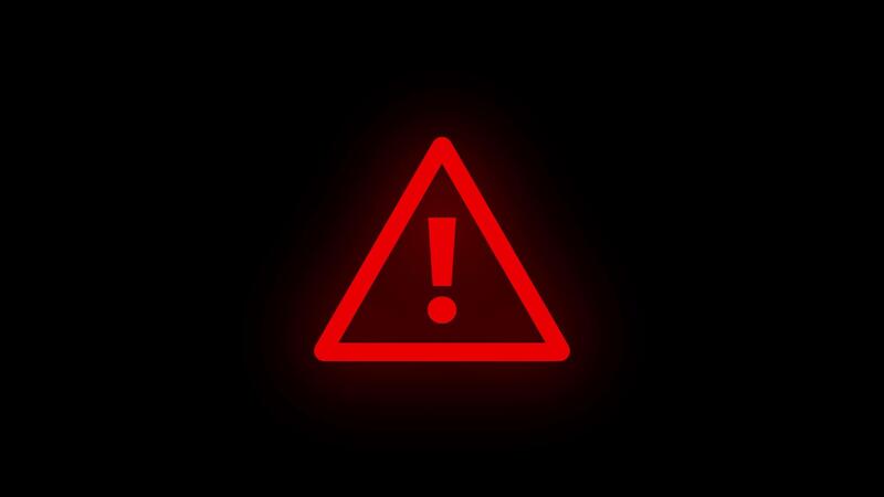 Red warning message, alert sign, exclamation mark inside a triangle on black bg. Alert notice, problem, danger, fail on emergency, alert notice, computer hacking error Pro Video