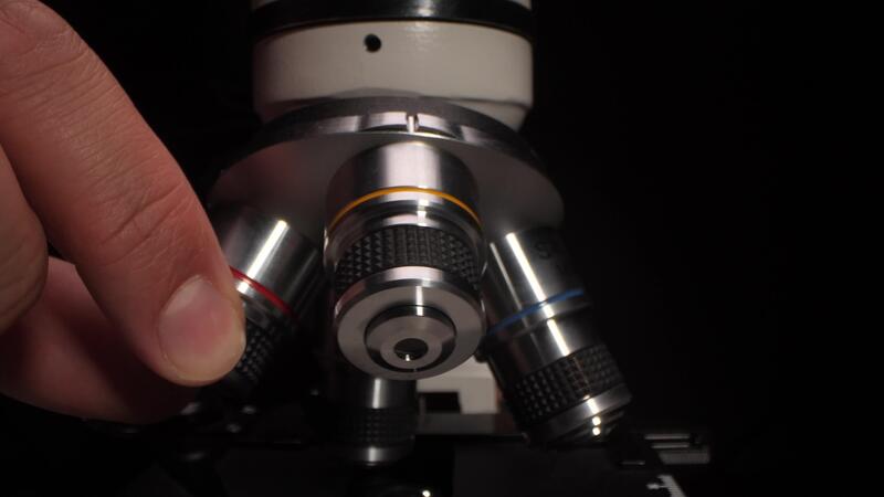 Scientist changing objective lens of microscope in laboratory Pro Video