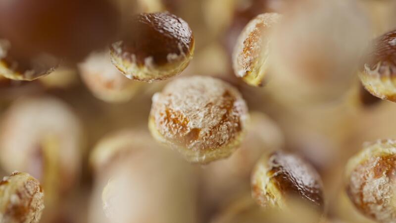 Animation of a group of donuts. Many donuts slowly rotate in the background in space. Horizontal composition. Close-up. Pro Video
