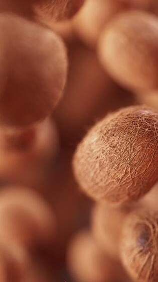 3D animation of a group of coconuts. Many coconuts slowly rotate in the background in space. Vertical composition. Defocus. Close-up. Pro Video