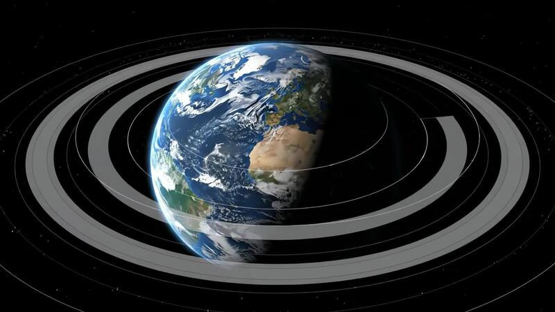 Dynamic Earth globe in dark space with abstract concentric rings, symbolizing global network and technology. Free Video