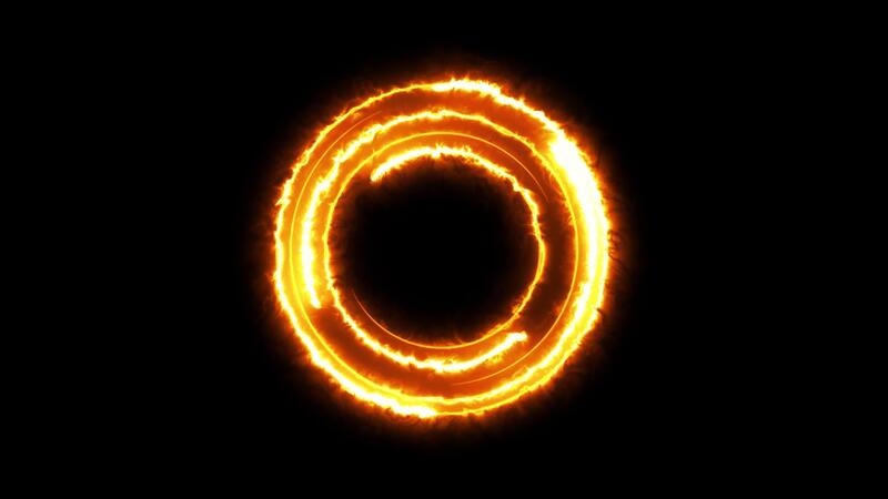 Seamless loop animation of a dynamic abstract design featuring fiery circular lines glowing in bright orange flames against a dark black background. Free Video