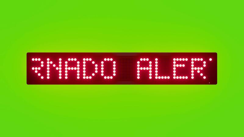 TORNADO ALERT SEEK SHELTER IN BASEMENTS OR SAFE ROOMS Scrolling Red Dot Matrix LED Text Animation on Green Screen Seamless Loop Free Video