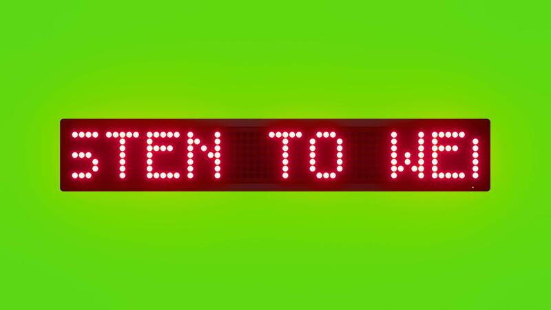 LISTEN TO WEATHER UPDATES AND LOCAL ALERTS Scrolling Red Dot Matrix LED Text Animation on Green Screen Seamless Loop Free Video