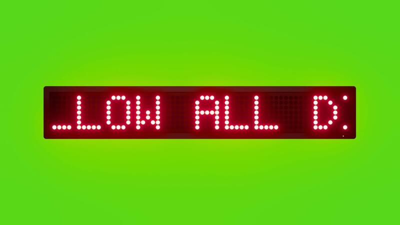 FOLLOW ALL DISPLAYED SIGNBOARDS Scrolling Red Dot Matrix LED Text Animation on Green Screen Seamless Loop Free Video