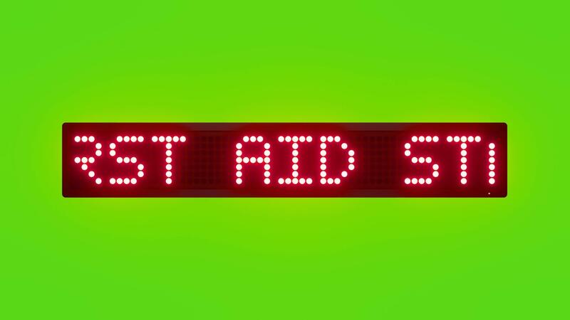 FIRST AID STATION LOCATED NEAR GATE Scrolling Red Dot Matrix LED Text Animation on Green Screen Seamless Loop Free Video