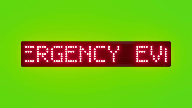 EMERGENCY EVACUATION ROUTES ARE MARKED IN YELLOW Scrolling Red Dot Matrix LED Text Animation on Green Screen Seamless Loop Free Video