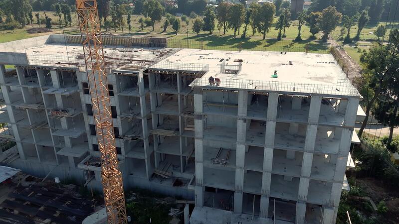 Multi storey reinforced concrete building under construction with crane, workers visible on roof and exposed framework showing progress of urban project Pro Video