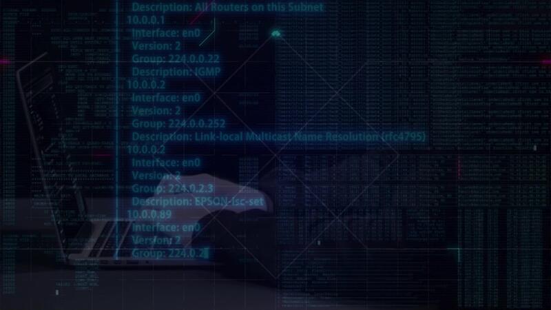 Hacker in Hood Working in Dark Room Laptop Keyboard Typing with Digital Virtual Script Free Video