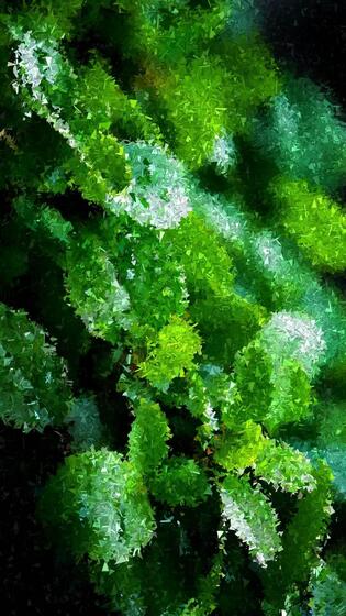Fragmented triangular textures blending into green leafed plants, abstract geometric mosaic design inspired by live nature Pro Video