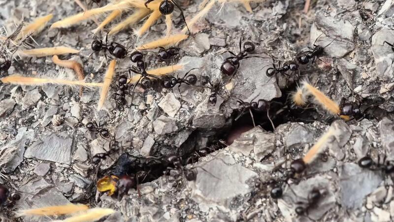 This nature showcases a colony of ants in a feeding frenzy, with closeups of them devouring a caterpillar and displaying teamwork Pro Video