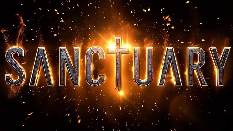 Sanctuary text in fiery effect with cross symbol representing divine refuge Free Video
