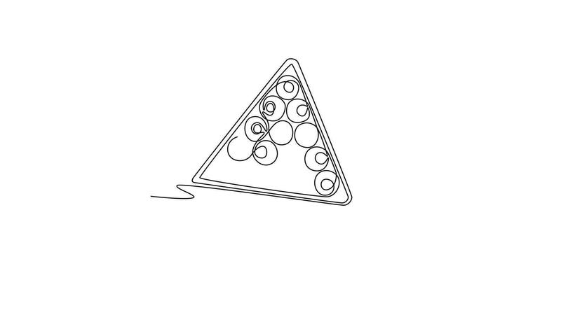 Self drawing animation of single line draw rack of billiard balls and a cue stick, symbolizing strategic start and poised anticipation of new game of pool. Continuous line draw. Full length animated Pro Video