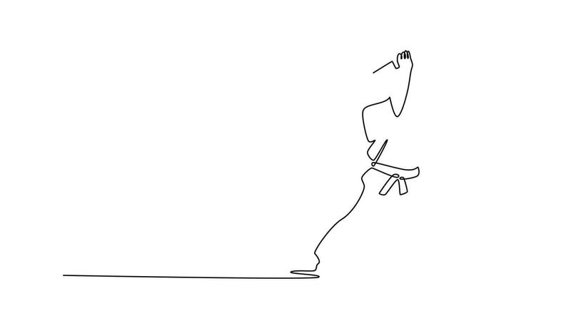 Animated self drawing of continuous line draw man in low stance holds a sword high overhead, poised for powerful strike, focus and grounded power of Aikido weapon form. Full length one line animation Pro Video