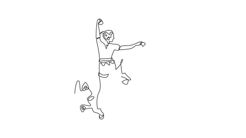 Self drawing animation of single line draw back view of female climbing a cliff in challenging pose, representing courage required to conquer the rock wall. Continuous line draw. Full length animated Pro Video