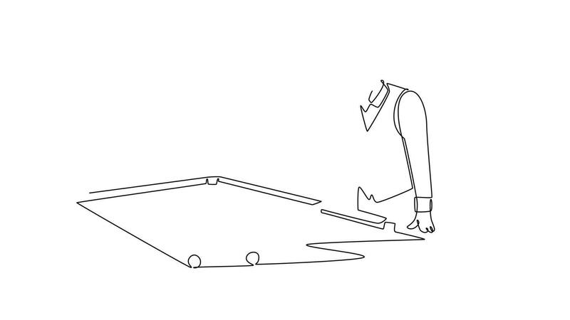 Animated self drawing of continuous line draw active male pool athlete aiming a cue stick, representing poised concentration and technical skill of a billiard player. Full length single line animation Pro Video