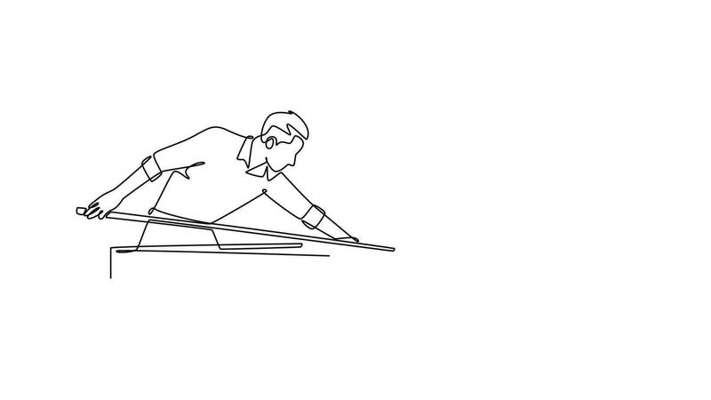 Animated self drawing of continuous line draw active male pool athlete aiming cue stick, representing the poised concentration and technical skill of billiard player. Full length single line animation Pro Video