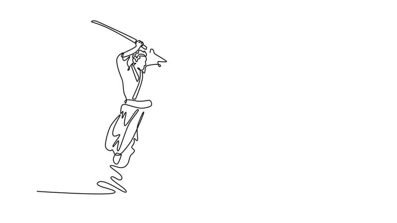 Self drawing animation single line draw two men in weapon drill, one figure attacking while airborne with sword, the other countering from low, grounded stance. Continuous line. Full length animated Pro Video