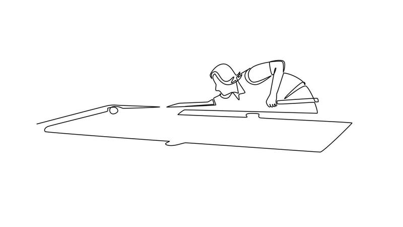 Self drawing animation of single line draw woman in a low, focused stance, aiming a shot on pool table. Precision, strategy, and concentration of the game. Continuous line draw. Full length animated Pro Video