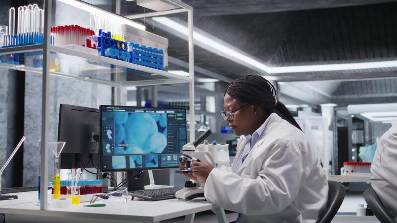 Black female expert analyzing samples in chemistry lab with microscope and observation tools. Scientist advancing genetics research, pathology analysis with biochemistry studies. Camera A. Pro Video